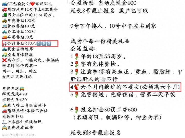上游新闻记者注意到,3月1日到4月中旬,杨姓中介就发布了近10条献血“兼职”信息,标题大多为“爱心互助”“公益活动”。其中,有多条信息提到,提供免费交通、住宿和餐食,到上海献血。信息还显示,400毫升的全血价格从400元到600元不等,血小板为350元。